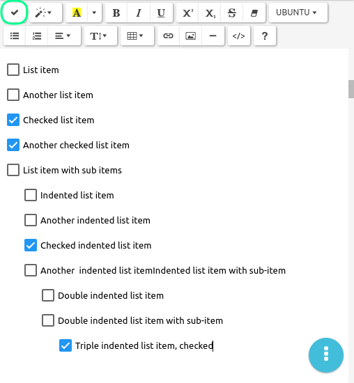 The recently added feature of interactive checkboxes makes TagSpaces ideal for creating simple, yet flexible ToDo lists. Pressing the Add Checkbox Button button will insert a checkbox anywhere in the text.