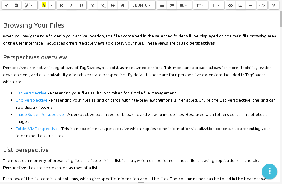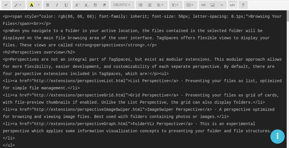 The formatting toolbar offers some common features you can find in any RichText or WYSIWYG HTML editor, with some features specific to TagSpaces. The overflow menu options from the HTML viewer are not implemented in the HTML Editor.