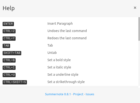 Ctrl+Z- Undo the last commandCtrl+Y- Redo the last commandTab- Insert TabShift+Tab- Remove tabCtrl+B- Set a bold styleCtrl+I- Set an italic styleCtrl+U- Set an underline styleCtrl+Shift+S- Set a strikethrough styleCtrl+\- Clear all stylesCtrl+Shift+L- Set left alignCtrl+Shift+E- Set center alignCtrl+Shift+R- Set right alignCtrl+Shift+J- Set full alignCtrl+Shift+7- Toggle unordered listCtrl+Shift+8- Toggle ordered listCtrl+Tab- Indent on current paragraphCtrl+Shift+Tab- Outdent on current paragraphCtrl+0- Change current paragraph's style to plain paragraph (<p>tag)Ctrl+1- Change current paragraph's style to H1Ctrl+2- Change current paragraph's style to H2Ctrl+3- Change current paragraph's style to H3Ctrl+4- Change current paragraph's style to H4Ctrl+5- Change current paragraph's style to H5Ctrl+6- Change current paragraph's style to H6Ctrl+Enter- Insert horizontal ruleCtrl+K- Show Link Dialog