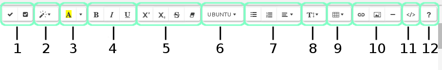 Bold (1), Italic (2), and Underline (3) will mark either the selected text or the text that follows as bold, italic, or underlined, respectively. These three buttons also have hotkeys assigned. Ctrl+b will toggle bold, Ctrl+i toggles italic, while Ctrl+u toggles underline.