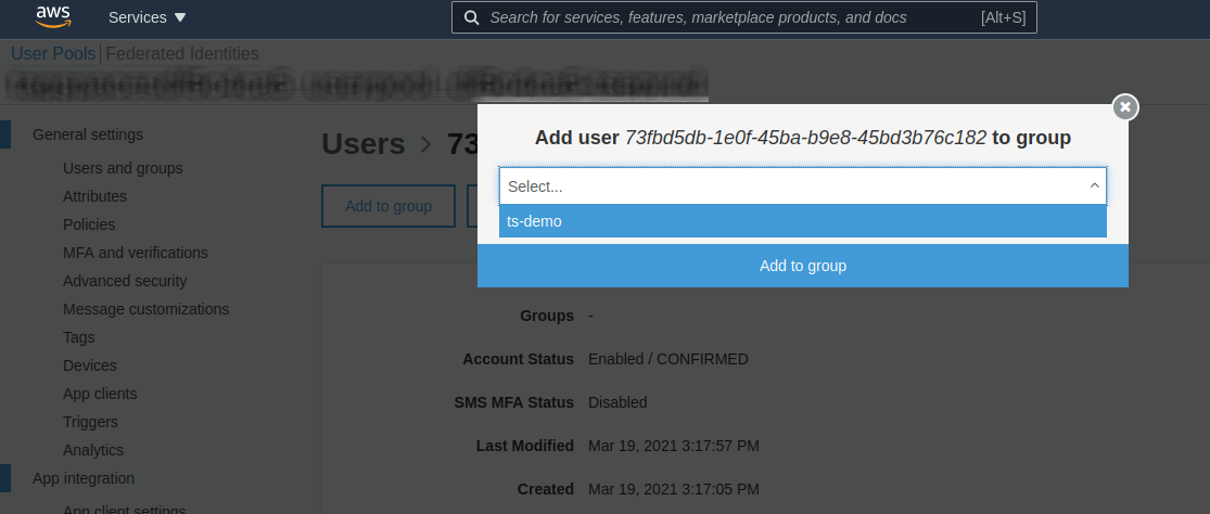 Important entries in both tables are id and tenant (ts-demo in the following example), which is actually a Cognito group. Using the groups you can have separate configuration for different group of users. So users assigned in Cognito to a given group will see the locations and tag groups configured with the group name as id and tenant.