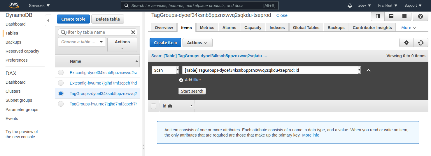 Open DynamoDB and insert records in Extconfig... and TagGroups... tables.